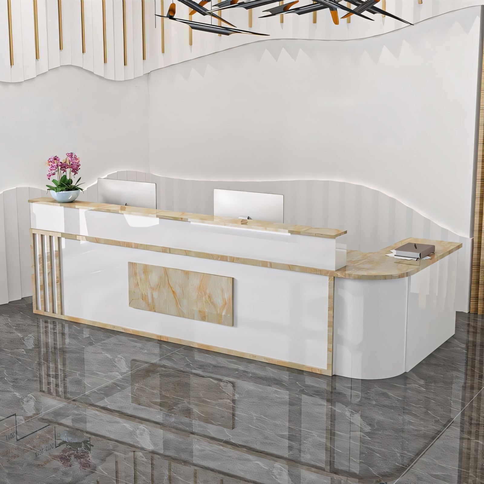 | Step into professionalism with our luxurious reception desk, meticulously crafted to redefine the ambiance of any workspace. Elevate the essence of your reception area with this captivating design, exuding elegance and sophistication. Its seamless blend of form and functionality creates an inviting atmosphere while making a striking first impression. Crafted with meticulous attention to detail, this desk radiates professionalism, offering a perfect balance of style and practicality. Transform your reception area into a symbol of refined taste and professionalism, setting the tone for exceptional client experiences. |