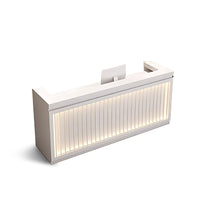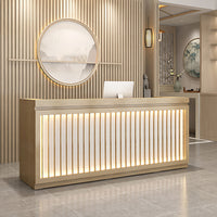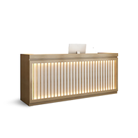| This oriental-style reception desk cleverly combines traditional elements with modern design. The tabletop is made of high-quality materials, strong and durable, and can easily hold computers and other office supplies. The vertical stripes on the facade are matched with soft built-in LED light strips to create a warm and layered atmosphere. The circular decorative painting on the background wall is a landscape pattern, exuding a unique oriental charm. | |