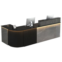 This minimalist modern reception bar desk elevates retail, service spaces clothing stores, etc. with LED ambient lighting and a sleek, durable E1-grade eco-gloss finish. Its dual-height, double-layer countertop enables versatile reception/work use, while integrated lockable drawers, a keyboard tray, and file cabinet offer secure storage. Reinforced structure, cable management holes, and customizable left/right orientations ensure adaptability and tidiness for any layout.