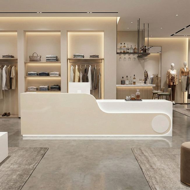 Curved Cashier Company Front Desk Counter JDT-7152 Its sleek, curved silhouette exudes modernity while offering an ergonomic haven for cashiers. Choose from a palette of colors to match your brand's aesthetic. Built with premium materials, it's tough...