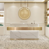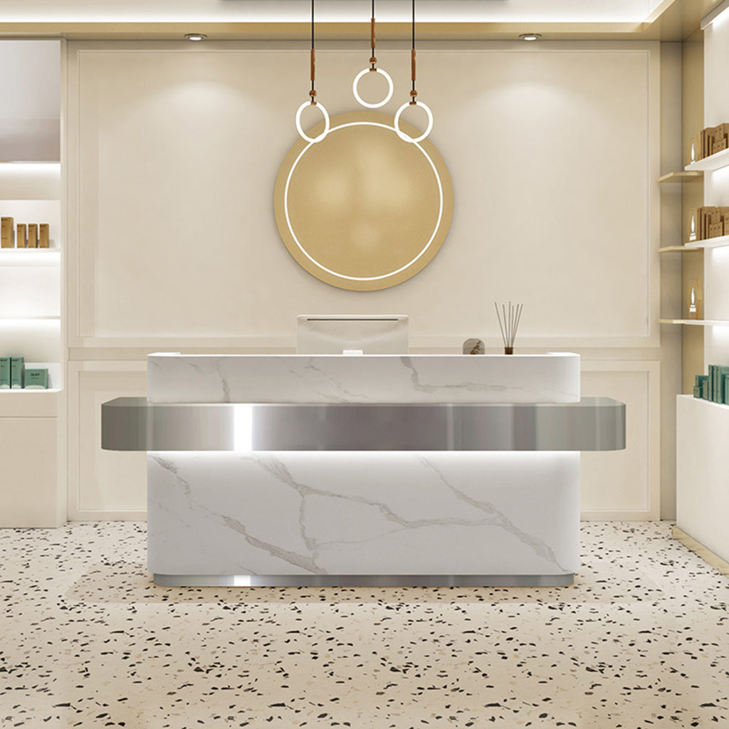This reception desk has a minimalist and modern design with smooth lines. The bottom and middle of the desk are designed with stainless steel decorative strips, which are high-quality and durable.
