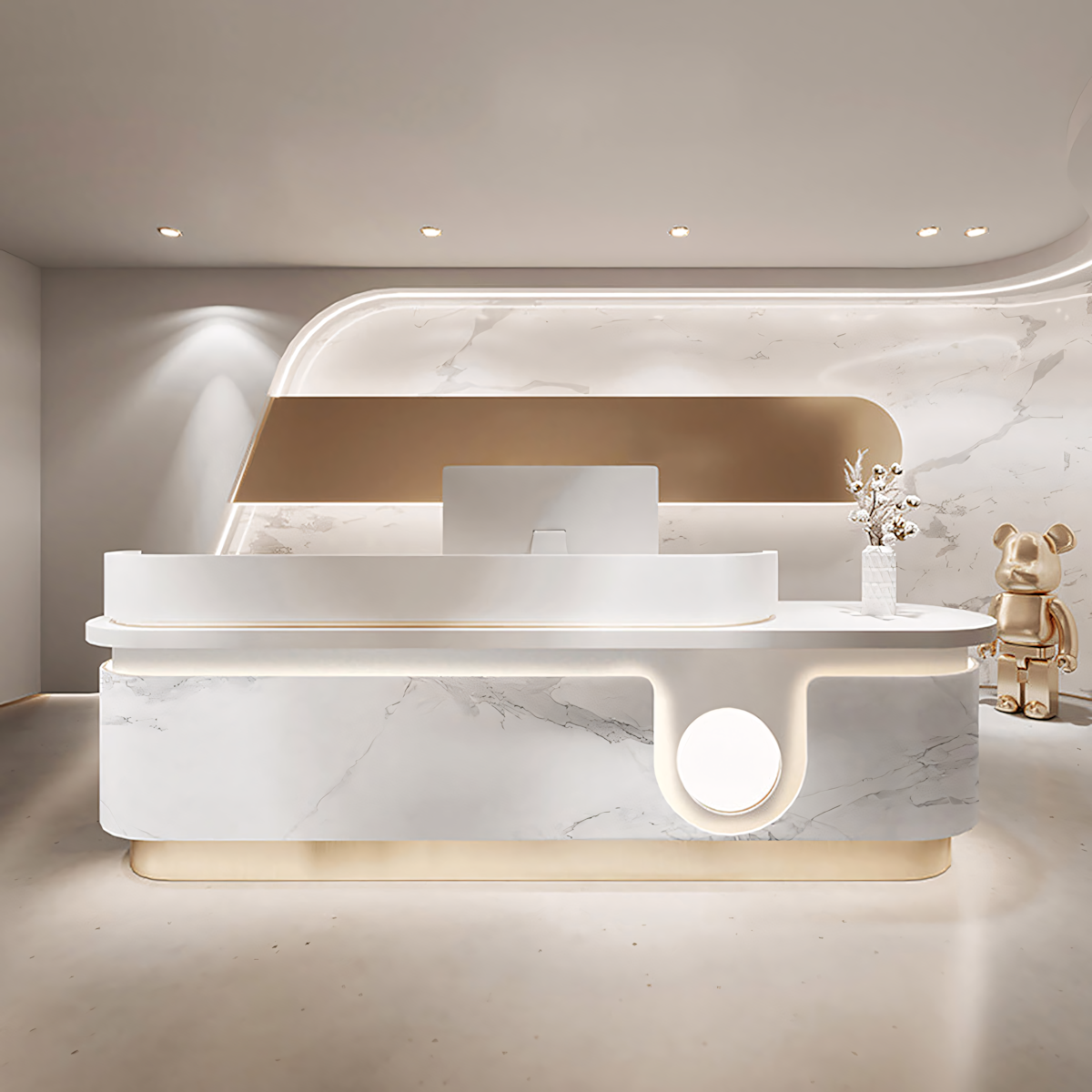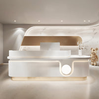 Descrption: Exuding a sense of sophistication and trendiness, the checkout counter for this popular and fashionable clothing store features a distinctive curved design with a marble-inspired finish. This well-crafted counter not only adds a touch of luxury but is also perfectly suited for reception areas in hair salons and beauty stores. Infusing a modern and elegant atmosphere, it transforms the front desk into a focal point, offering customers a unique and stylish shopping and service experience. |