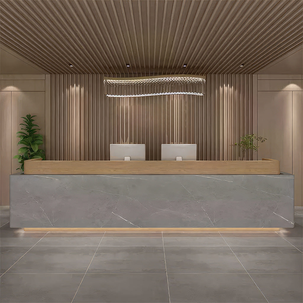 This reception desk combines modern and minimalist styles. The marble-textured tabletop is matched with the wooden top edge, and the overall look is very high-end.