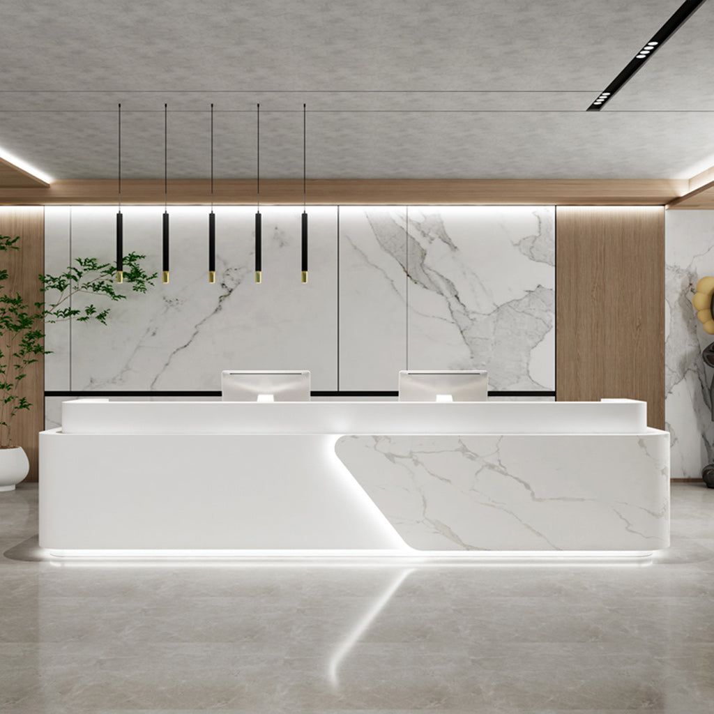 This reception desk is creative and minimalist. The overall shape is elegant, and the design lines are smooth. There is the wooden decorative strip above the desktop, which adds a warm and special feeling.