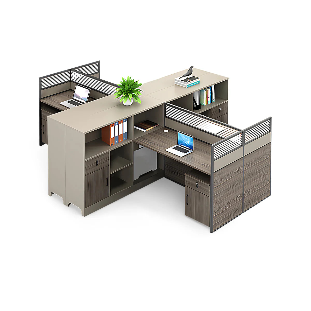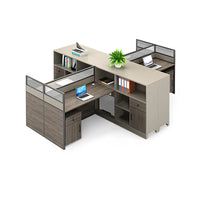 | This modular desk setup enhances comfort and support, boosting productivity. A unique soundproof partition design adds privacy by effectively blocking typing sounds and phone conversations.The open storage compartments provide versatile space for organizing files, documents, and personal items like plants. | |